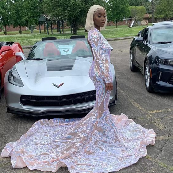 Sparkly Sexy Illusion Sequined Lace Prom Dresses Deep V neck Long Sleeves Evening Gowns Custom Made Birthday Party Wear Backless Sequins