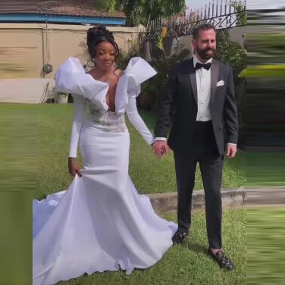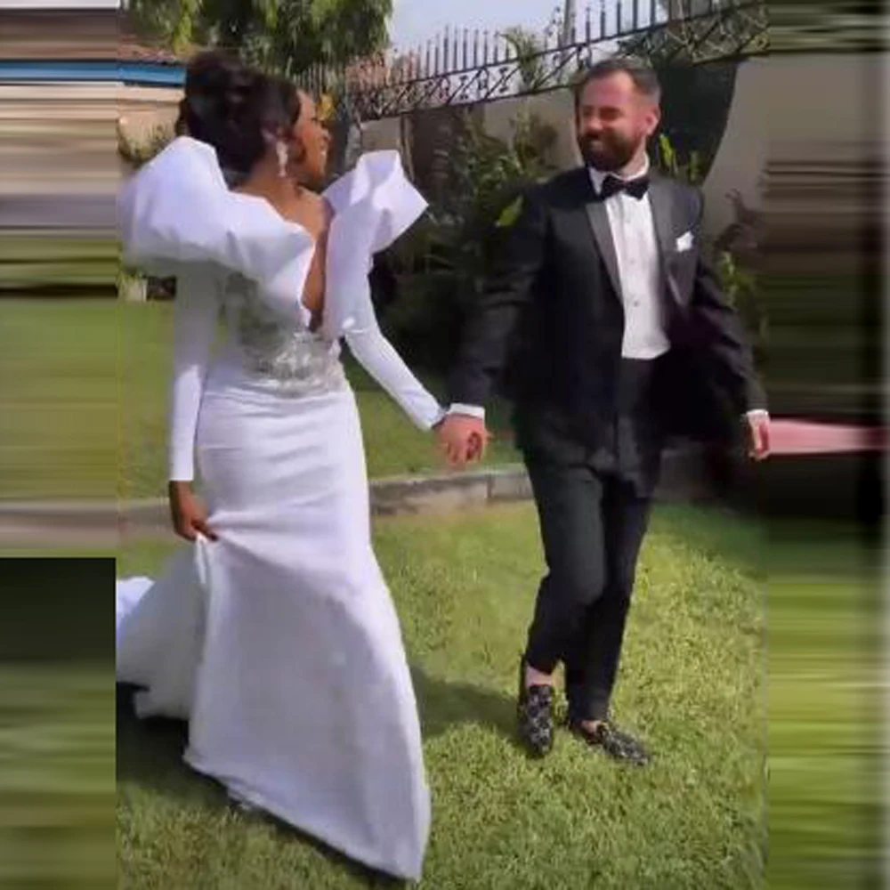 African Women Evening Dresses With Puffy Shoulders Long Sleeves Mermaid Prom Dress Beads Appliques Womrn Formal Party Gowns