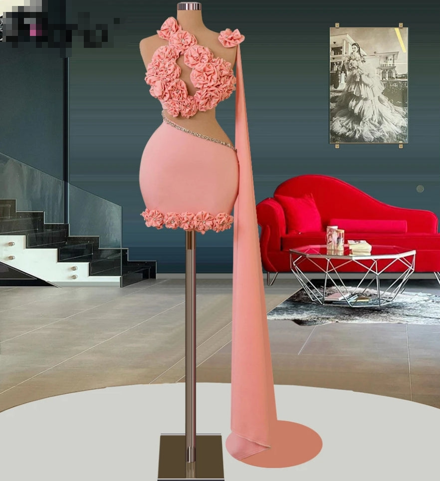 Baby Pink Cute Party Dress 3D Flower Summer Short Tight-Fitting Dress Arabic Occasion Dresses Mini Birthday Party Wear