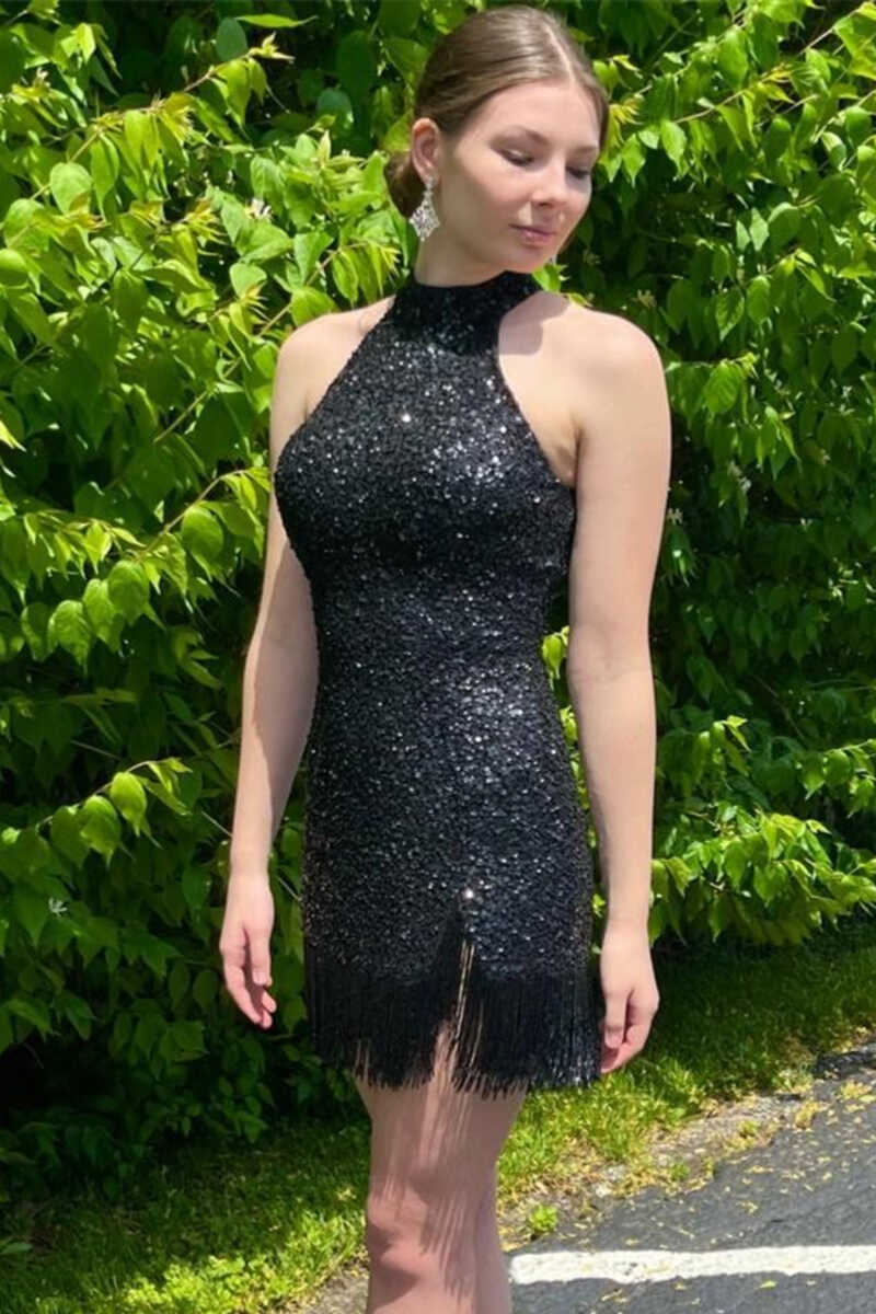 Black Sequins Halter Tassel Mini Party Dress
