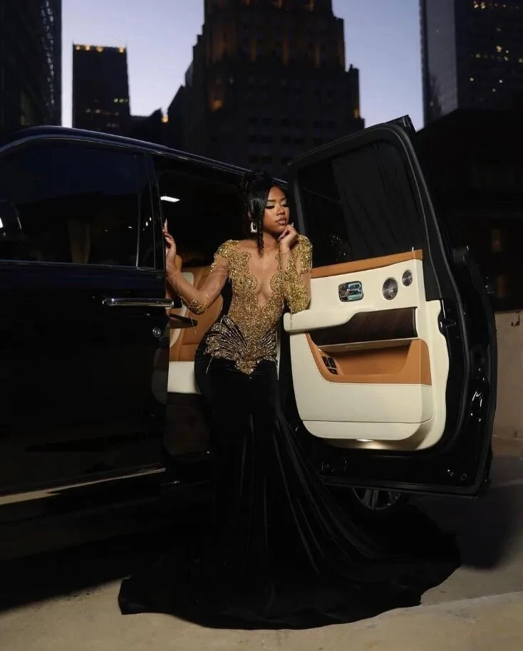 Black Velvet Long Sleeve Trumpet Prom Dresses For African Women With Gold Crystal Beaded Sheer Mesh Birthday Gown