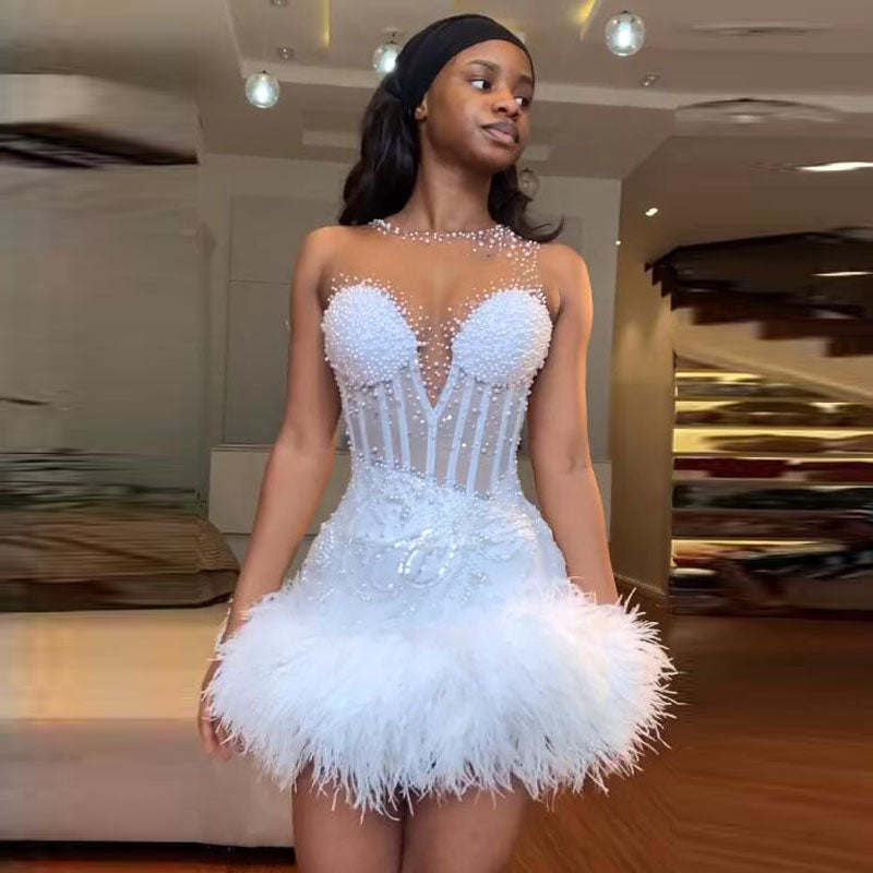 Chic and Unique Style White Evening Dress with Feathers Beading Mini Prom Dress Pearls Short Birthday Party Dresses for Women