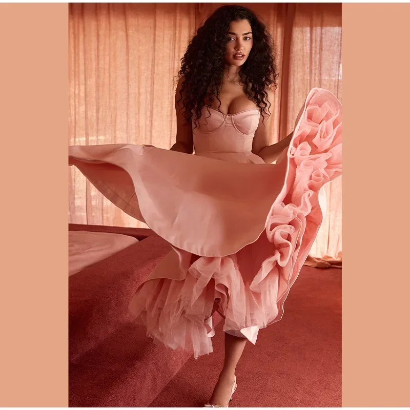 Elegant Double Layer Mesh Spliced Midi Dresses Women Fashion Square Neck Sleeveless Backless Dress