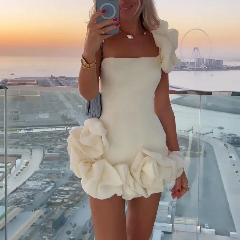 Elegant Flower Edge Mini Dress Women Fashion Slim Off Shoulder Rose Pleated Short Robe Spring Female Party Evening Dresses