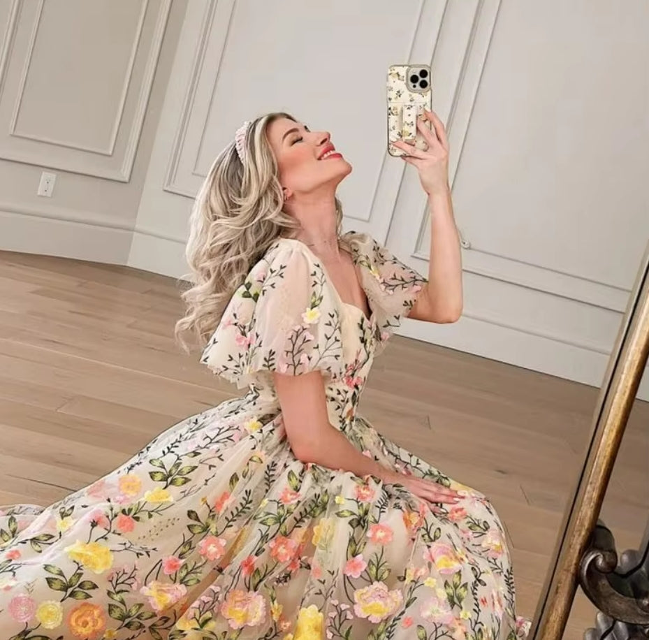 Flower Lace Embroidery Tulle Fabric Prom Dress Modest A-line vestidos de fiesta Short Sleeves Elegant