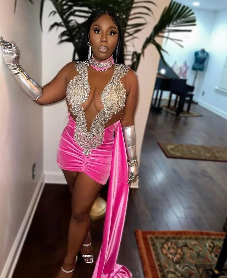 Fuchsia Pink Velvet Mini Evening Cocktail Dresses with Train Sparkly Crystal Black Girl Birthday Party Gown vestido festa