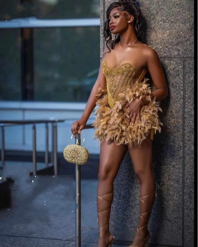 Luxury Feathers Birthday Dresses For Black Girl Beading Sequin Short Prom Party Gowns Sheer Neck Clubbing Dress