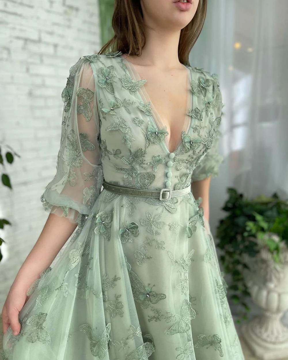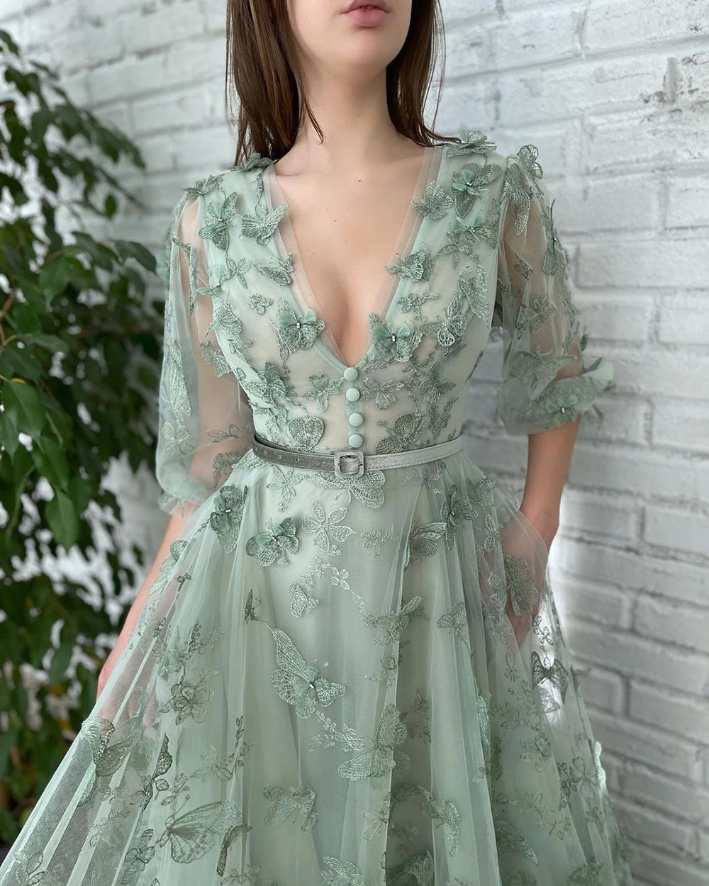 Green Butterfly Tulle Prom Dresses V Neck Long Sleeves Velvet Belt Evening Gowns Formal Party Dress with Pockets