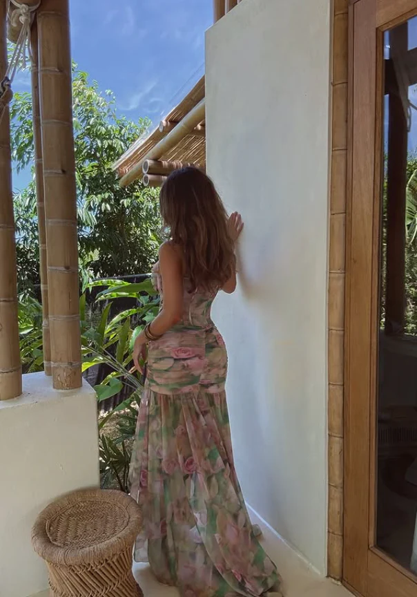 Green Mermaid Spaghetti Strap Print Floral Corset Tulle Prom Dress Party Dress