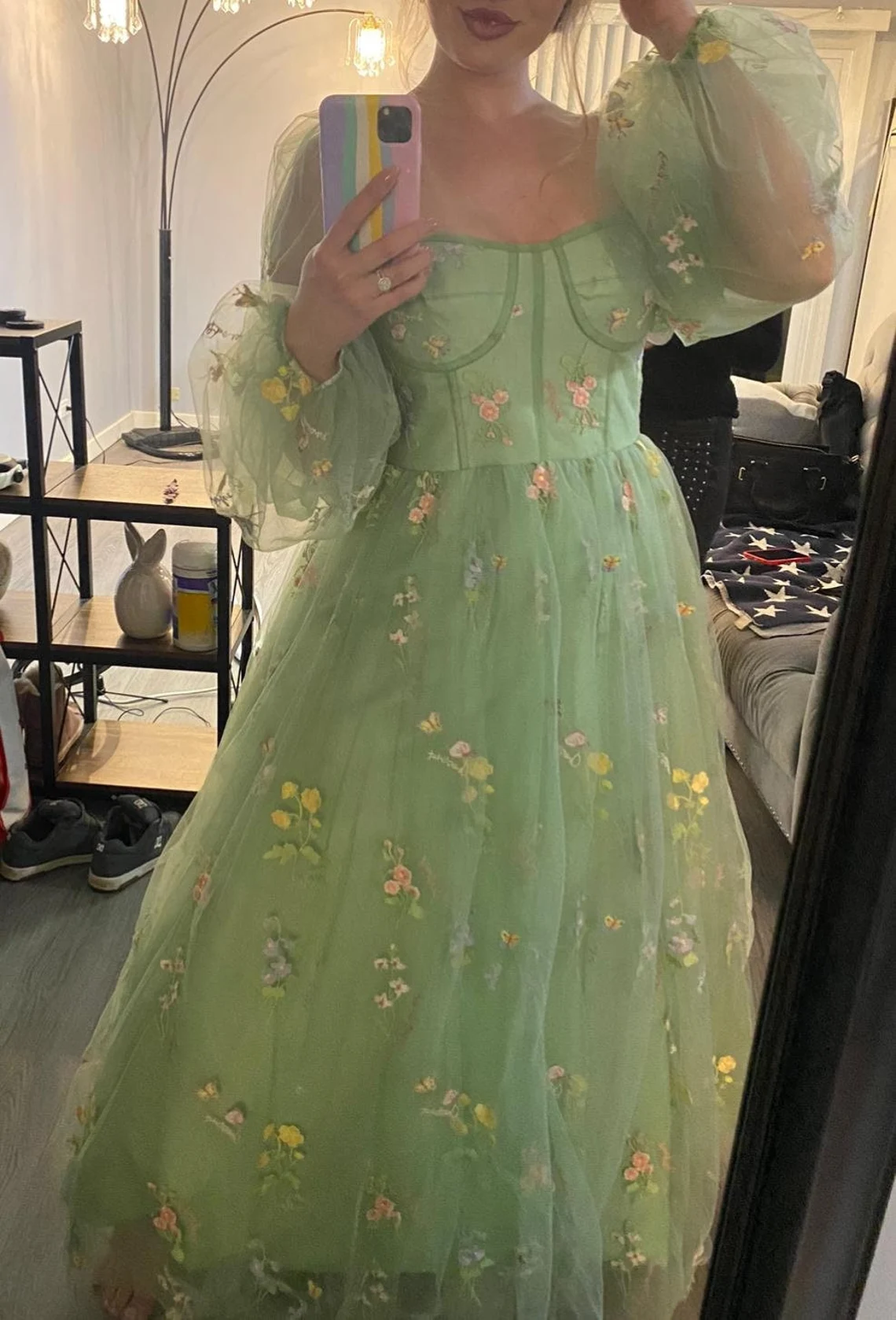 Green Tulle Prom Dress, Sweetheart Neckline Dress, Long Sleeves Embroidered Prom Dress, Flower Dress Ankle Length Dress, Tulle Prom Dress