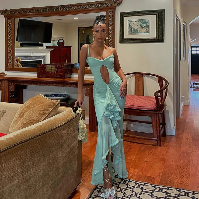 Hollow Out Ruffles Mesh Dress Woman Summer Spaghetti Strap Sexy Irregular Tassel Patchwork Fungus Trim Skinny Vestidos Party