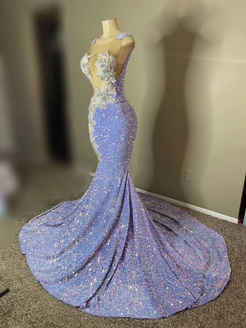 Lilac African American Prom Dresses Mermaid Sheer Sequins Appliques Beaded Black Girls Nigeria Robe De Soiree Evening Gown