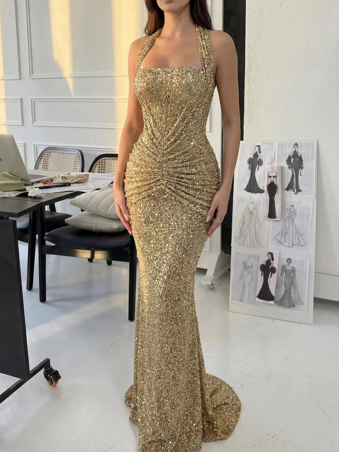 Luxurious Gold Halter Sleeveless Pleated Sequins Mermaid Prom Dress