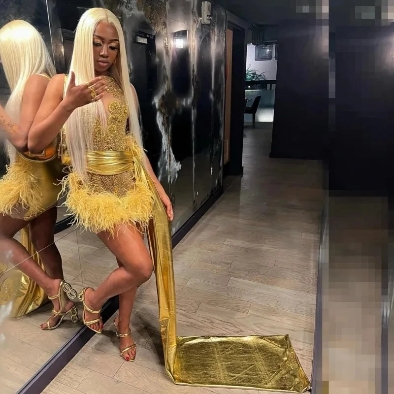 Luxury Gold Prom Dresses With Train Rhinestone Feathers Mini Party Gowns Women Birthday Outfit Vestidos De Gala