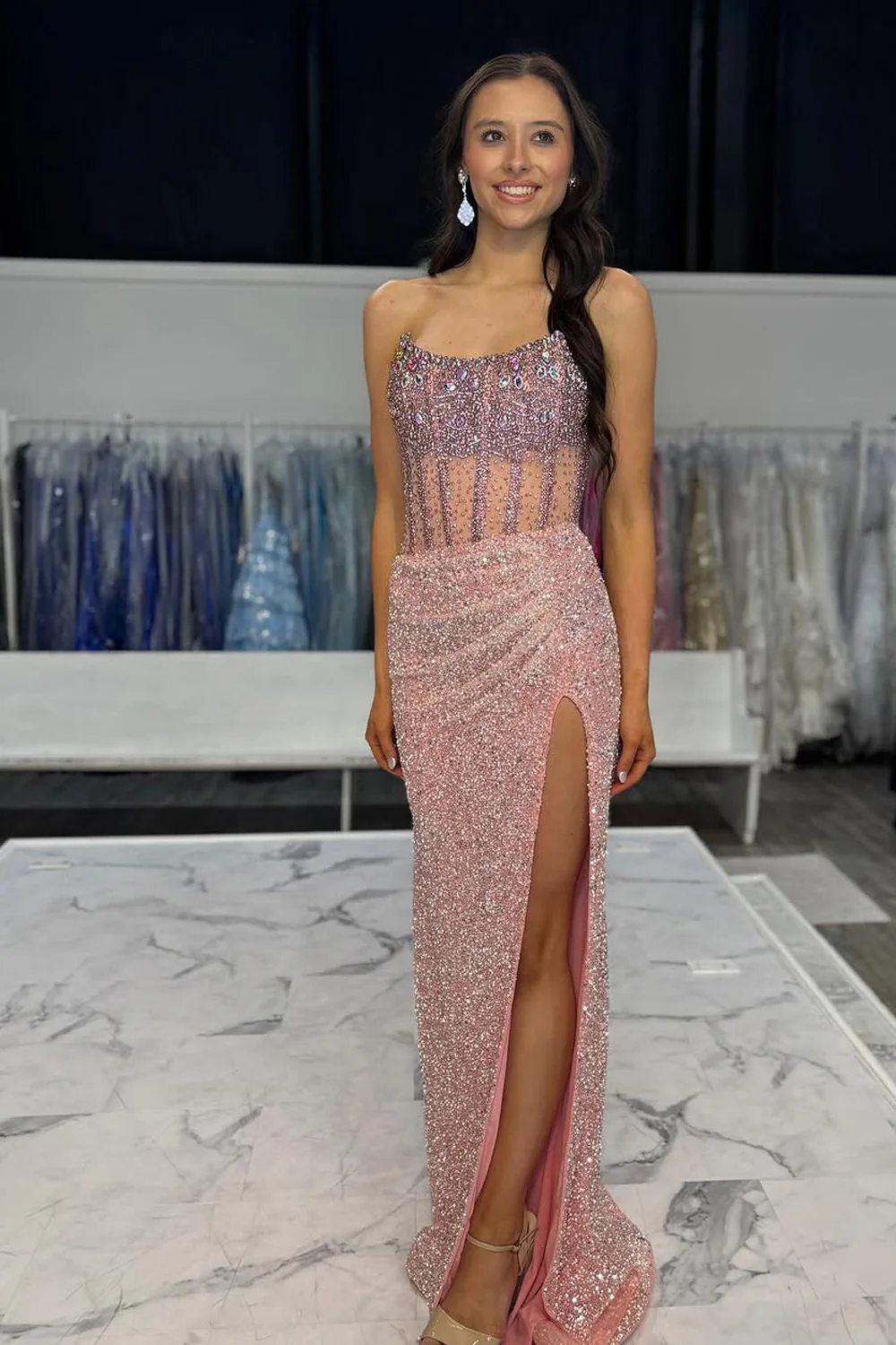 Mermaid Strapless Pink Sequins Beads Long Prom Dresses with Slit
