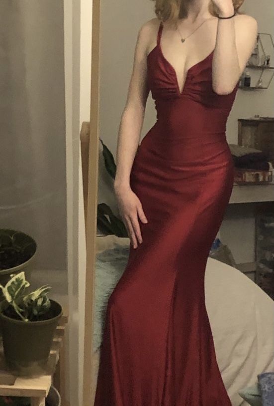 Mermaid V Neck Cross Back Burgundy Satin Long Prom Dress