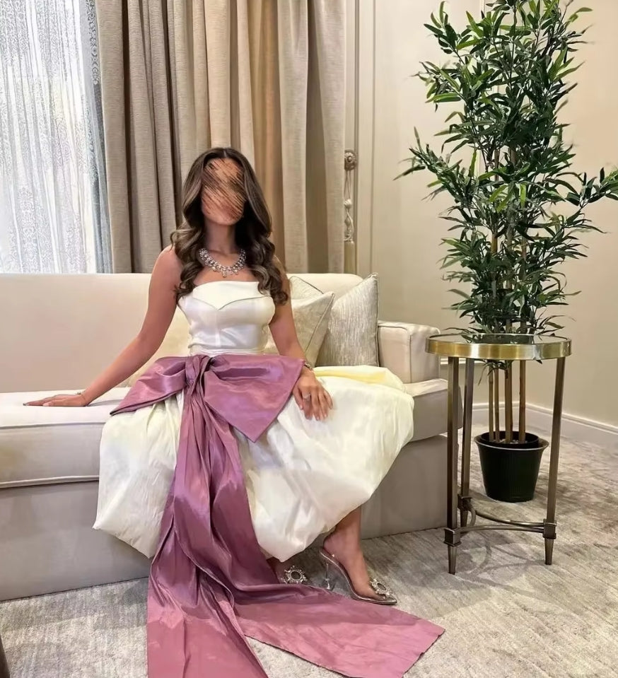 New Mid Evening Dresses Sleeveless Tea-Length Strapless Bow Women Formal Occasion Party Dress