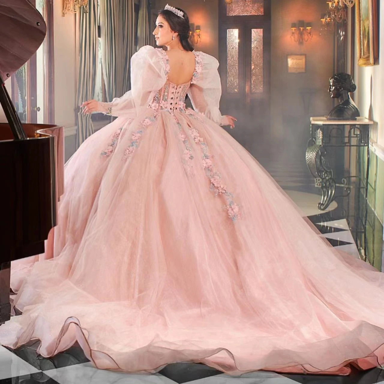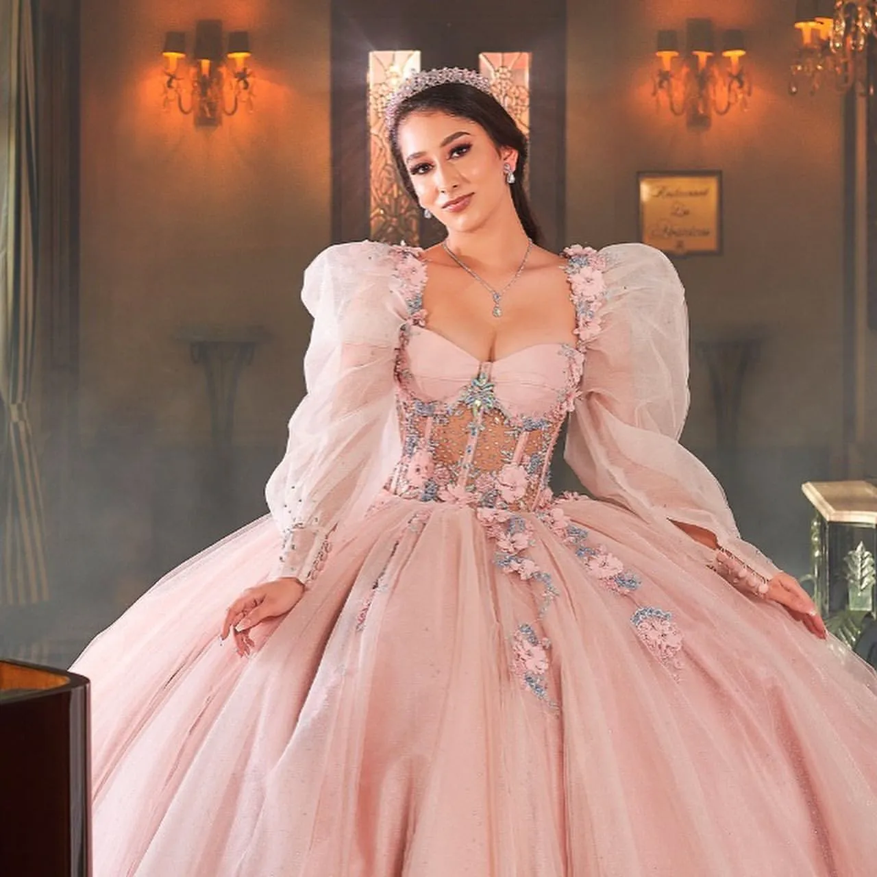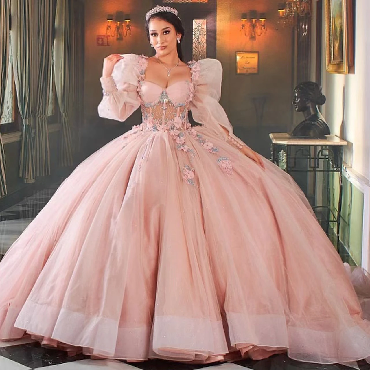 New Pink Quinceanera Dress Ball Gown 2002 For Sweet 16 Girl Beading Appliues Long Sleeve Graduation Party Princess Gowns