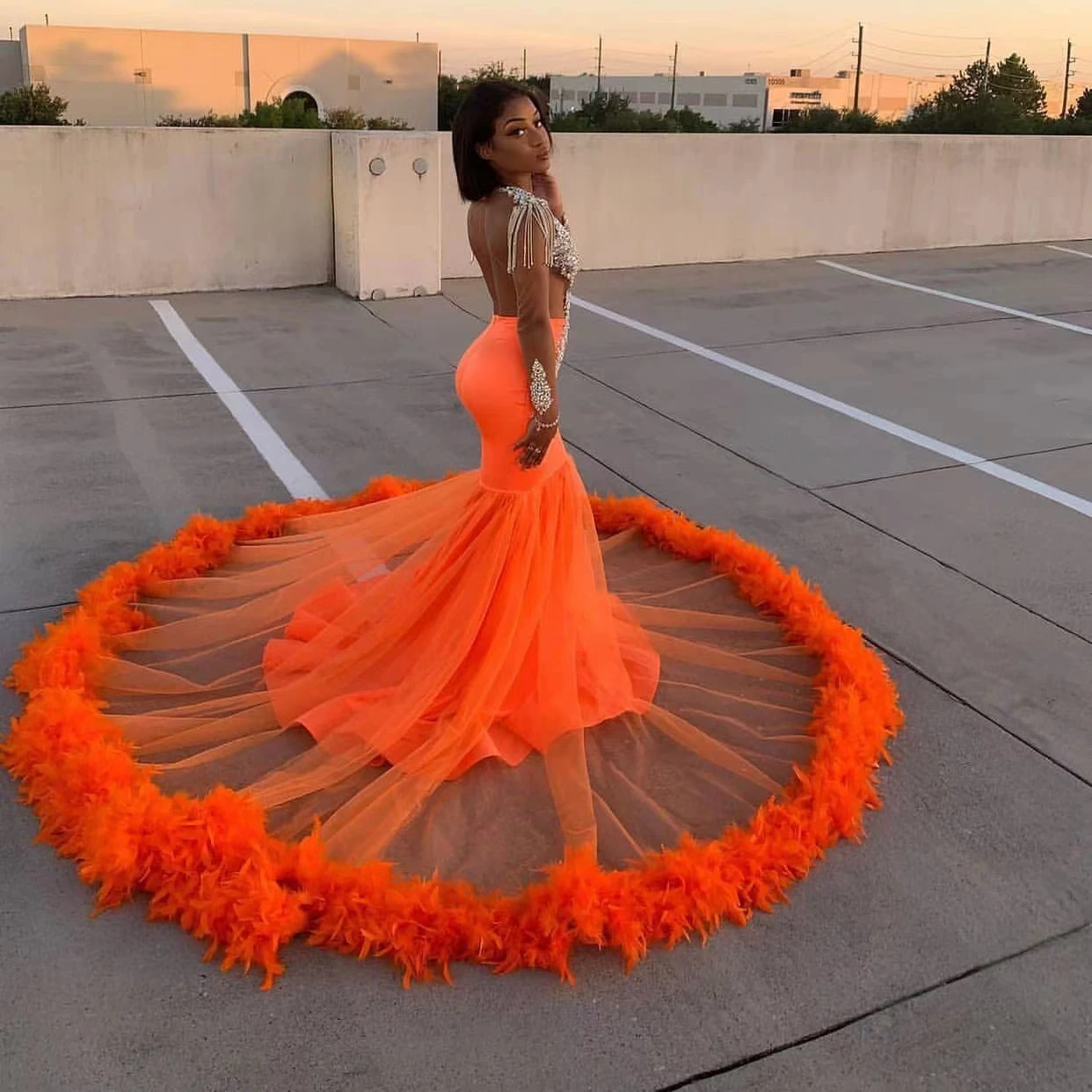 Orange African Prom Dresses Beading Sequined Deep V Neck Feahers Long Mermaid Eveing Dress Formal Party Gowns Vestidos Plus Size