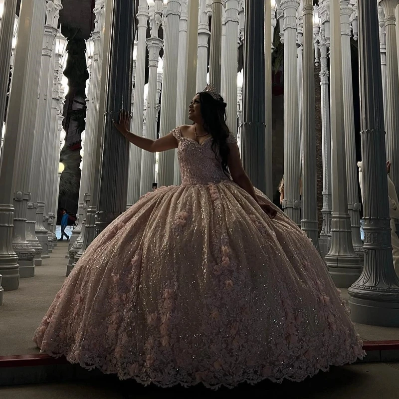 Pink Shiny Ball Gown Quinceanera Dresses Beads Sweetheart Applique 3DFloral Brithday Dance Party Vestidos 15 De Quinceañera