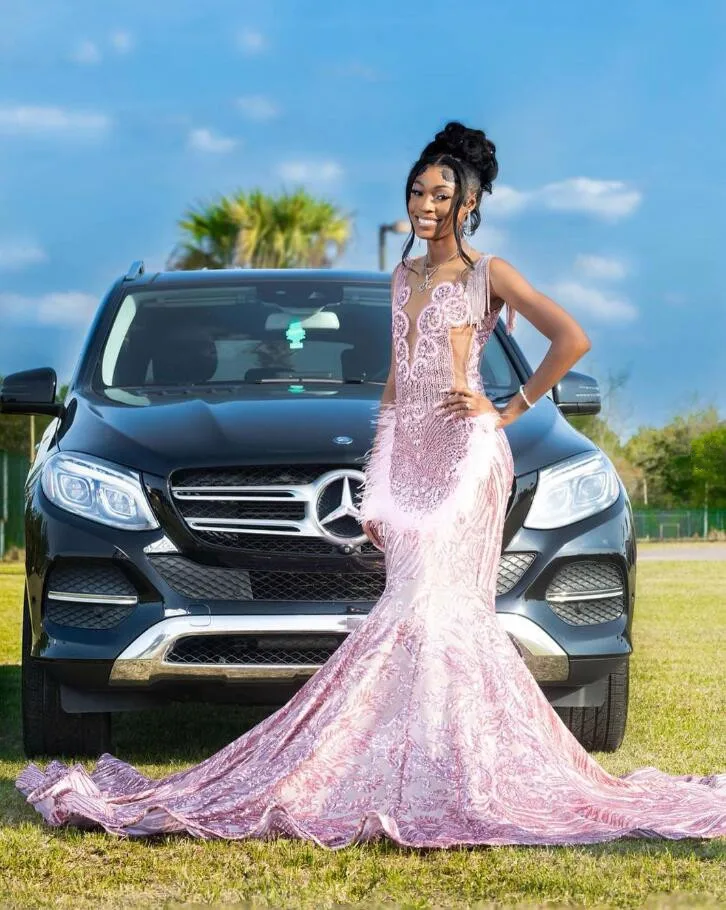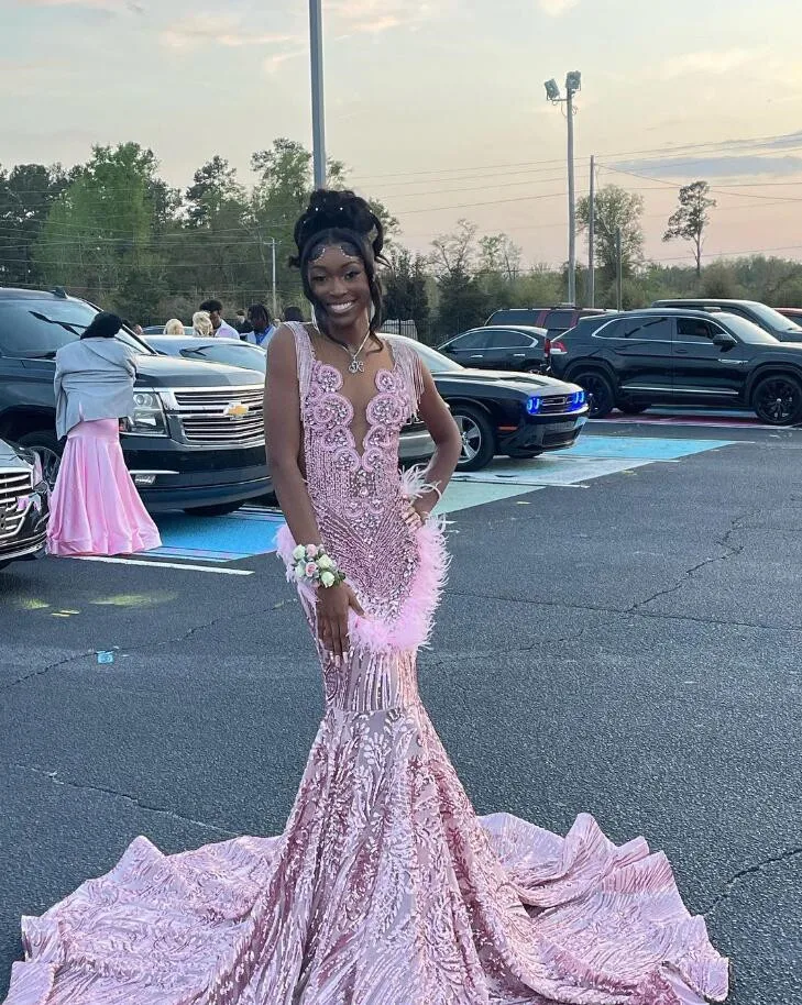 Pink Sparky Long Mermaid Prom Birthday Party Dresses Gillter Diamond Crystal Feahter Sequins Evening Gown vestidos de noite