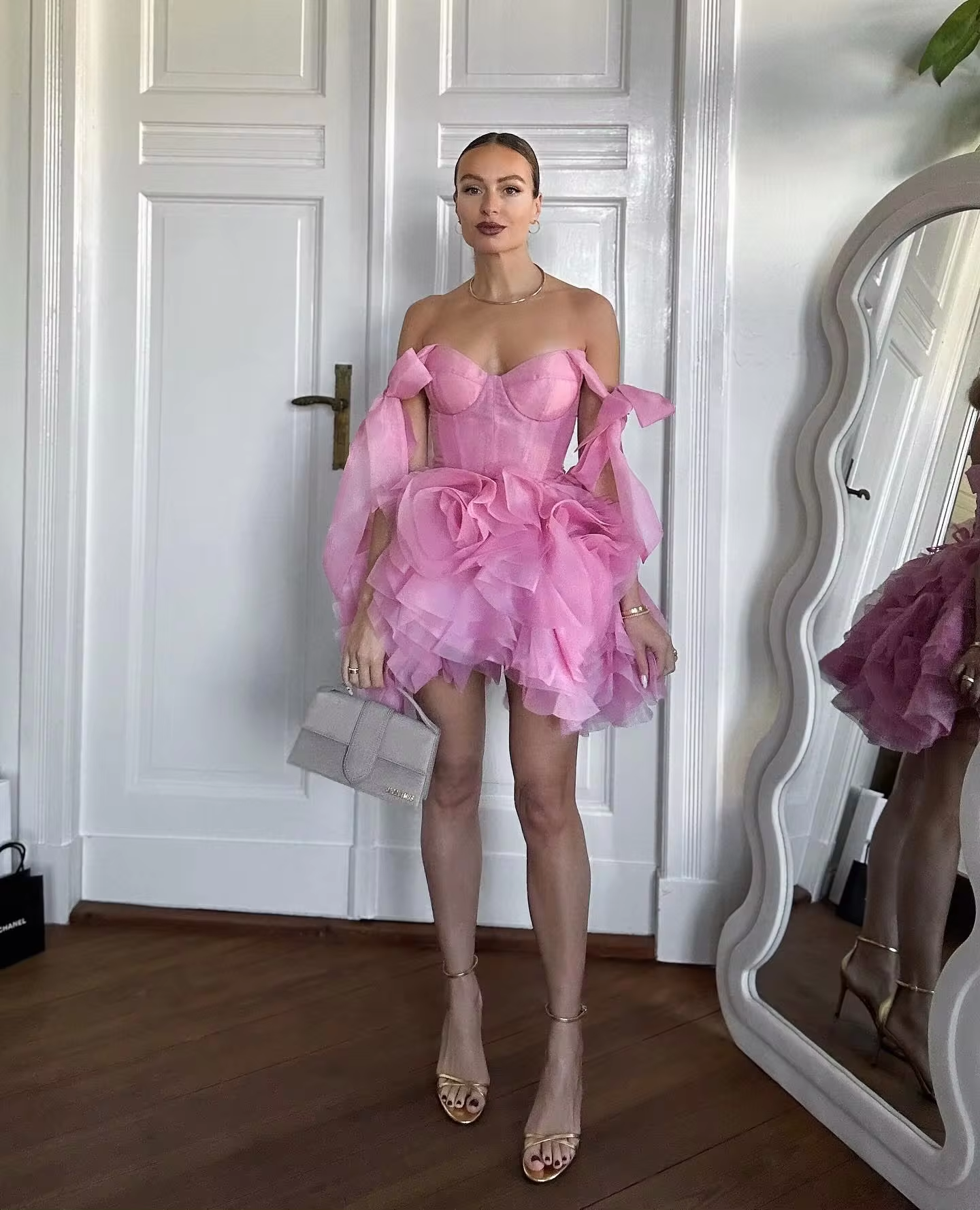 Pretty Handmade Flowers Prom Dresses Off The Shouder Bow Ruffles Tiered Tulle Mini Party Dress Puffy Mesh Pageant Gowns Z
