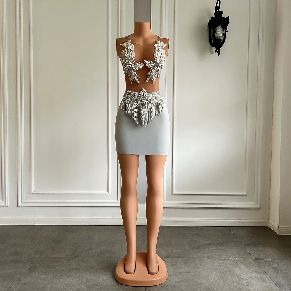 Sheer Mesh Birthday Party Formal Gowns Sparkly Silver Diamond Spandex Mini Black Girls Short Prom Dresses