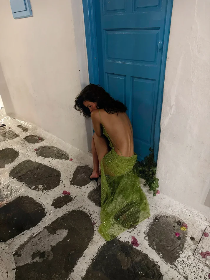 Sexy Green Sheath Spaghetti Strap Beaded Tulle Prom Dress Evening Dress with Slit