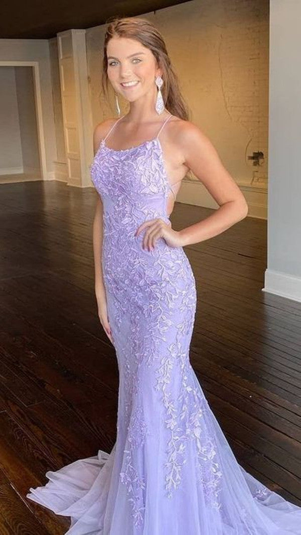 Lavender applique mermaid prom dress,halter spaghetti straps tulle long evening party gown