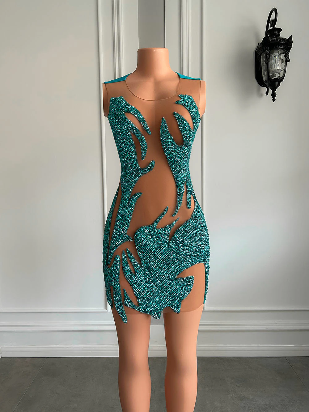 Sexy Sheer See Through Women Cocktail Birthday Party Gowns Blue Crystals Black Girl Short Prom Dresses