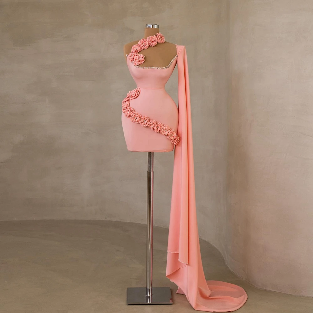 Chic 3D Flowers Crystals Cocktail Dress Pretty one Shoulder Satin Mini Evening Prom Gowns Sweet Bridal Short Celebrity Dresses