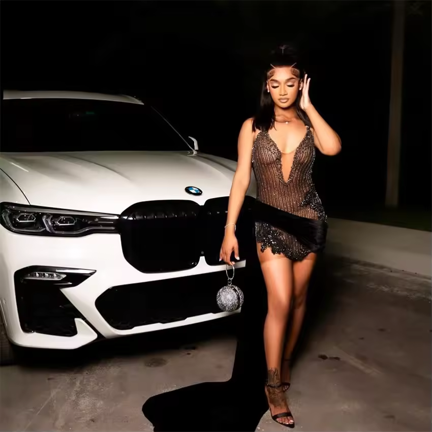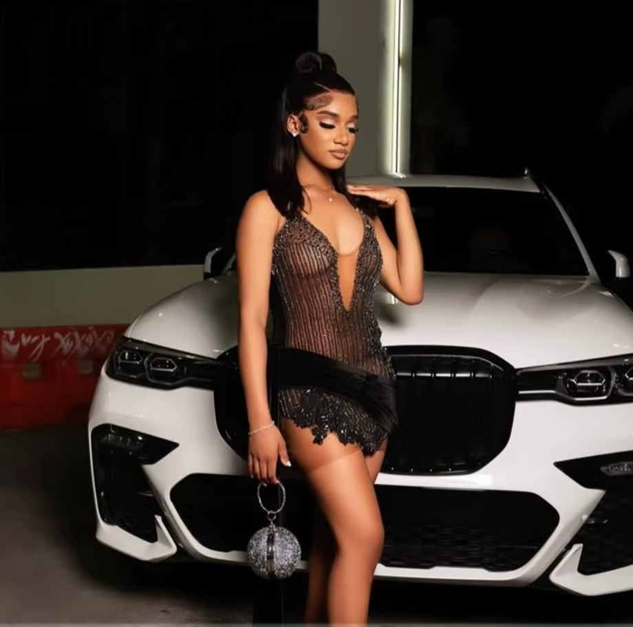 Shining Black Bead Short Prom Dress For Black Girl Sparkly Rhinestones Senior Cocktail Side Train Dress Birthday Gown Customized