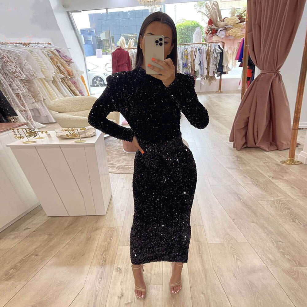 Shiny Sequins Mermaid Evening Dresses for Women Tea Length High Neck Long Sleeves Formal Prom Wedding Party Gowns,BG036