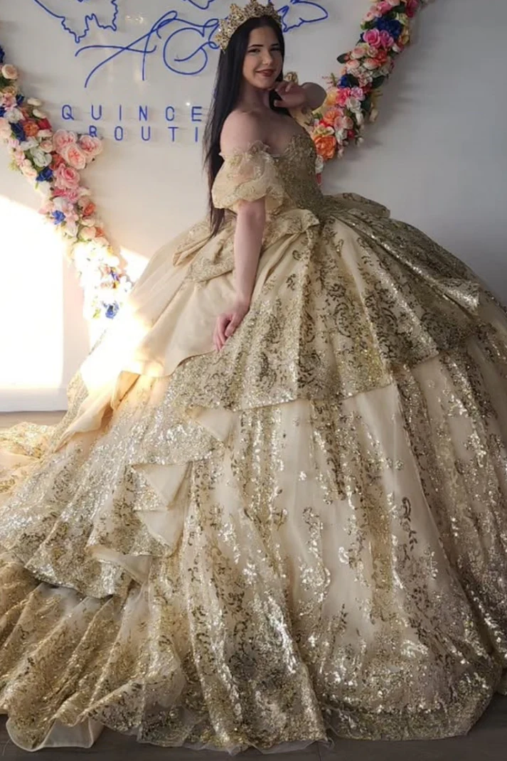 This gold quinceañera dress combines a strapless neckline with delicate short sleeves, creating an elegant and modern look. Intricate appliques and layered ruffles add texture and sophistication, while a tasteful bow knot at the waist enhances the silhouette with a subtle touch of charm. Designed for a memorable Sweet 15, this gown offers refined details that celebrate youthful elegance.