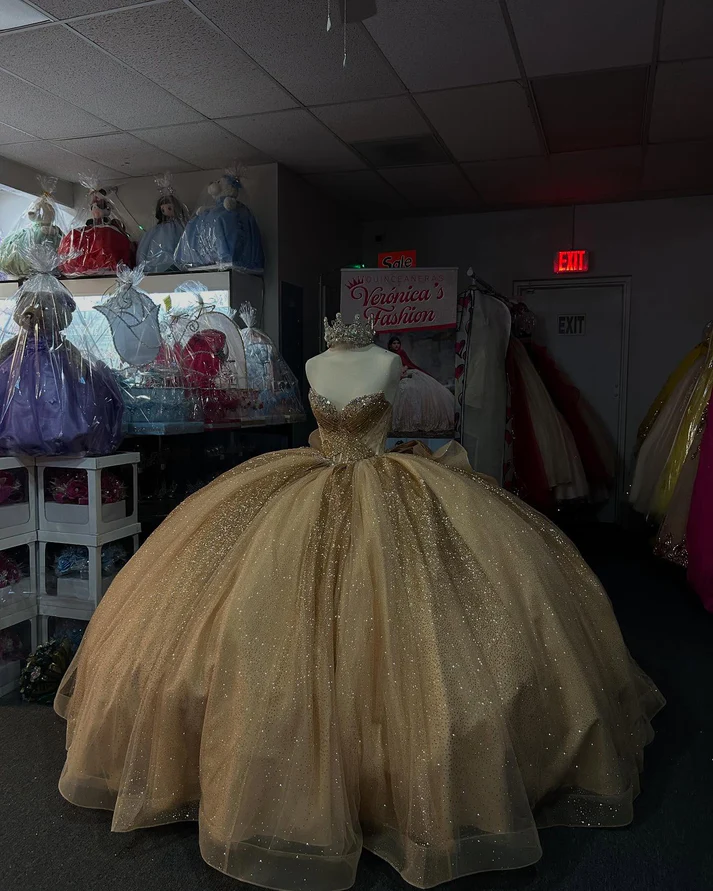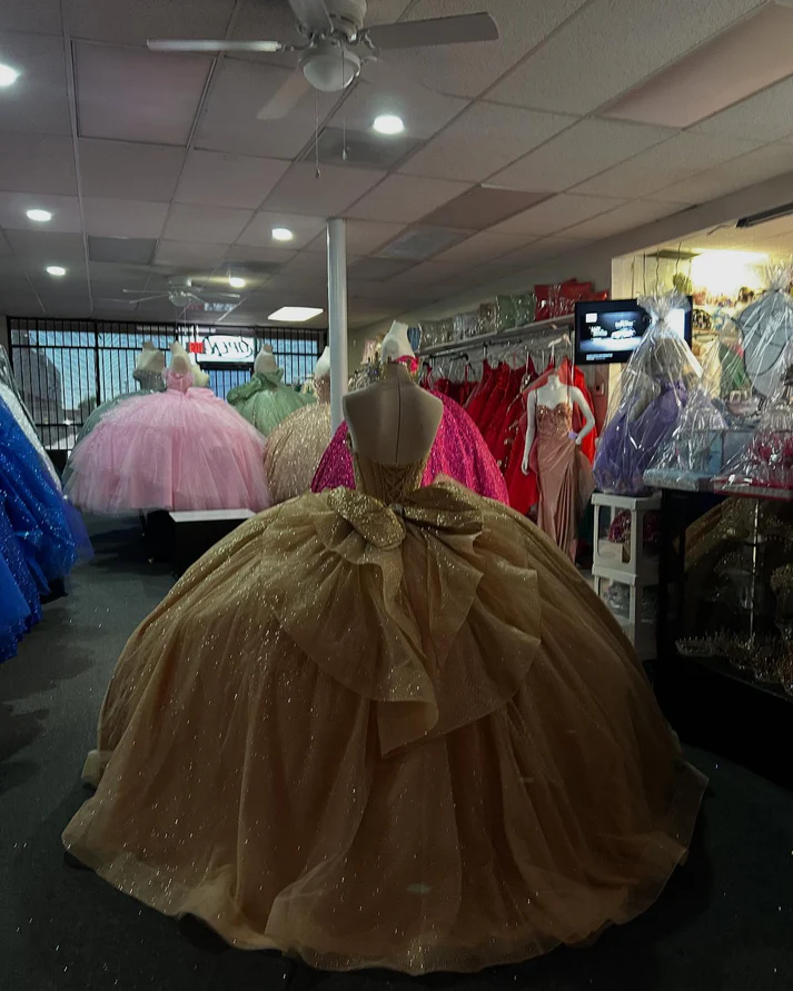 This strapless, sleeveless quinceañera dress in shimmering gold showcases intricate beaded detailing and layered ruffles that create a dynamic, elegant silhouette. The bow knot accent at the waist adds a refined touch, balancing sophistication with youthful charm. Designed for a memorable Sweet 15 celebration, this gown combines luxurious textures and expert craftsmanship to ensure a standout appearance.