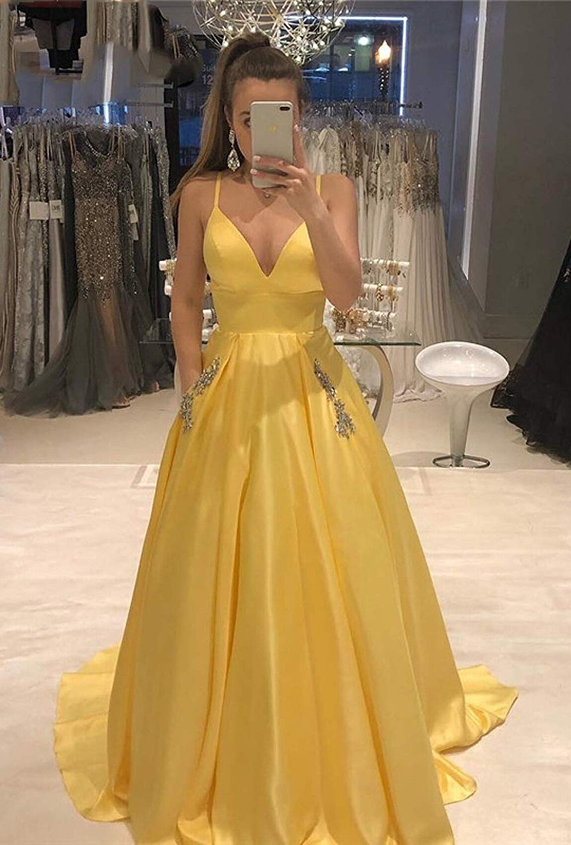 V Neck Beaded Satin A-line Ball Gown Prom Dress Women's Long Spaghetti Straps with Pockets vestidos de fiesta robes de soirée,MW022