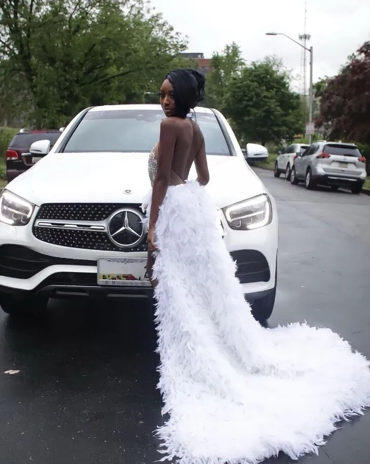 White Feather Short Prom Homecoming Dresses with Detachable Train Crystal Beaded Birthday Party Gown vestidos de noche