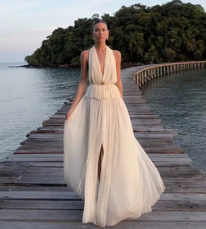 Women Sexy Gauze Backless Halter Pleated Cropped Tank Tops Suits Chic Splited Elastic Waist Long Skirts 2 Pcs Sets Lady Outfits