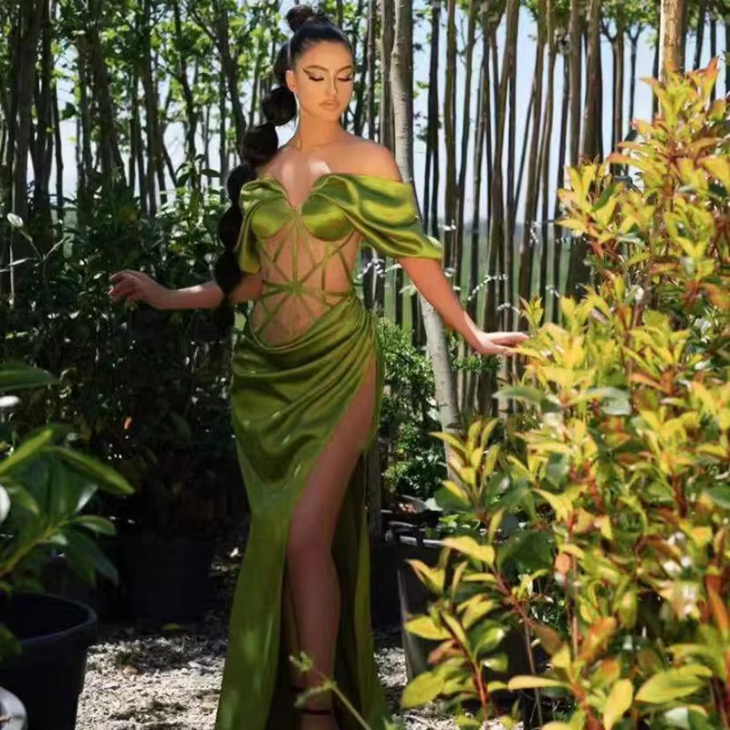 Women Sexy Mint Cut Out Ruffles Satin Ball Gowns High Slit Birthday Party Evening Dresses Long Club Prom Dress