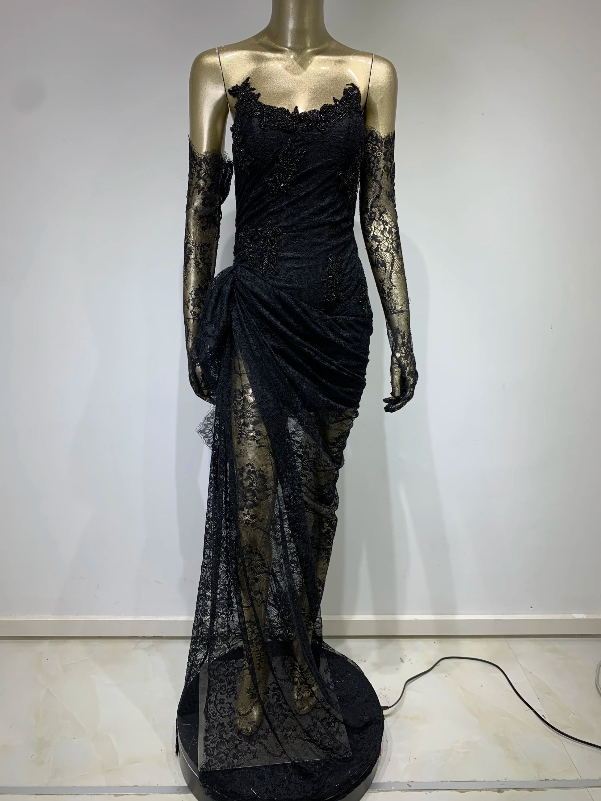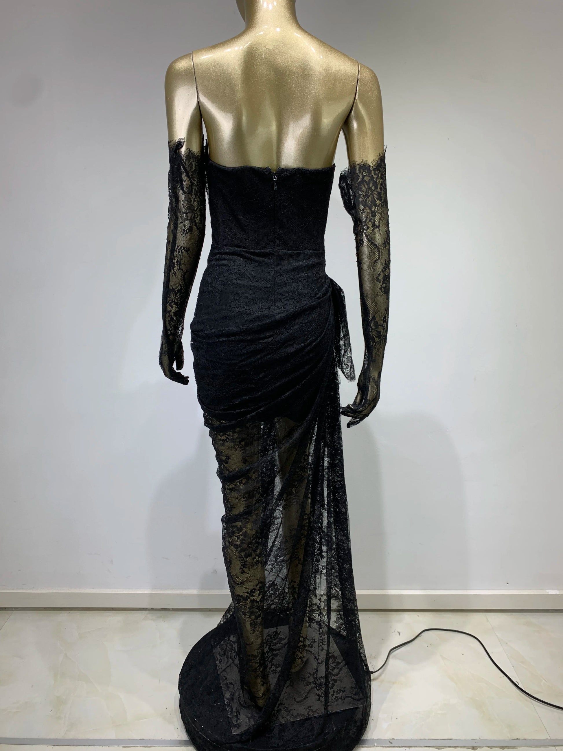 Women Summer Sexy Strapless Backless Black Lace Gloves Maxi Long Dress Elegant Evening Party Club Dress